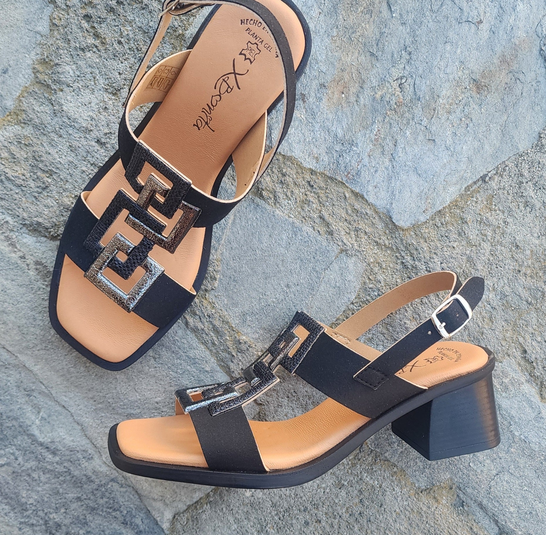QUE is a block heeled sandal with weaved straps and an ankle strap buckle.