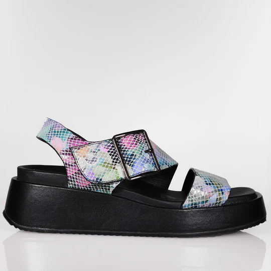 SAM is a block heeled sandal with a wide buckle strap detail and a smooth...
